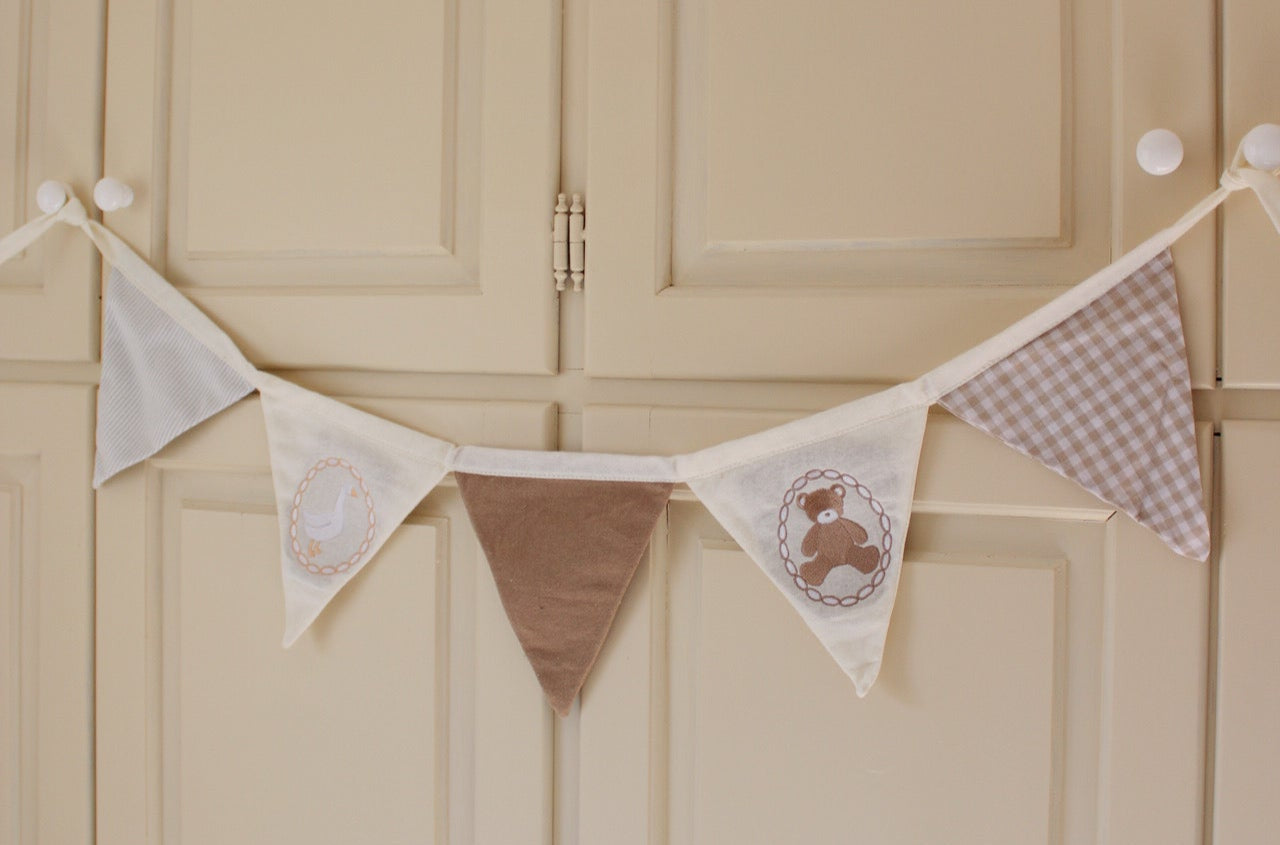 Composta da 5 triangoli in tessuti coordinati, di cui due con i ricami esclusivi di Milly l’oca e Lou l’orsetto, porta un tocco poetico e delicato in ogni angolo.