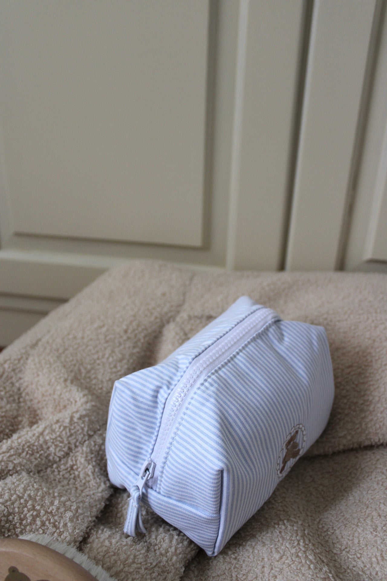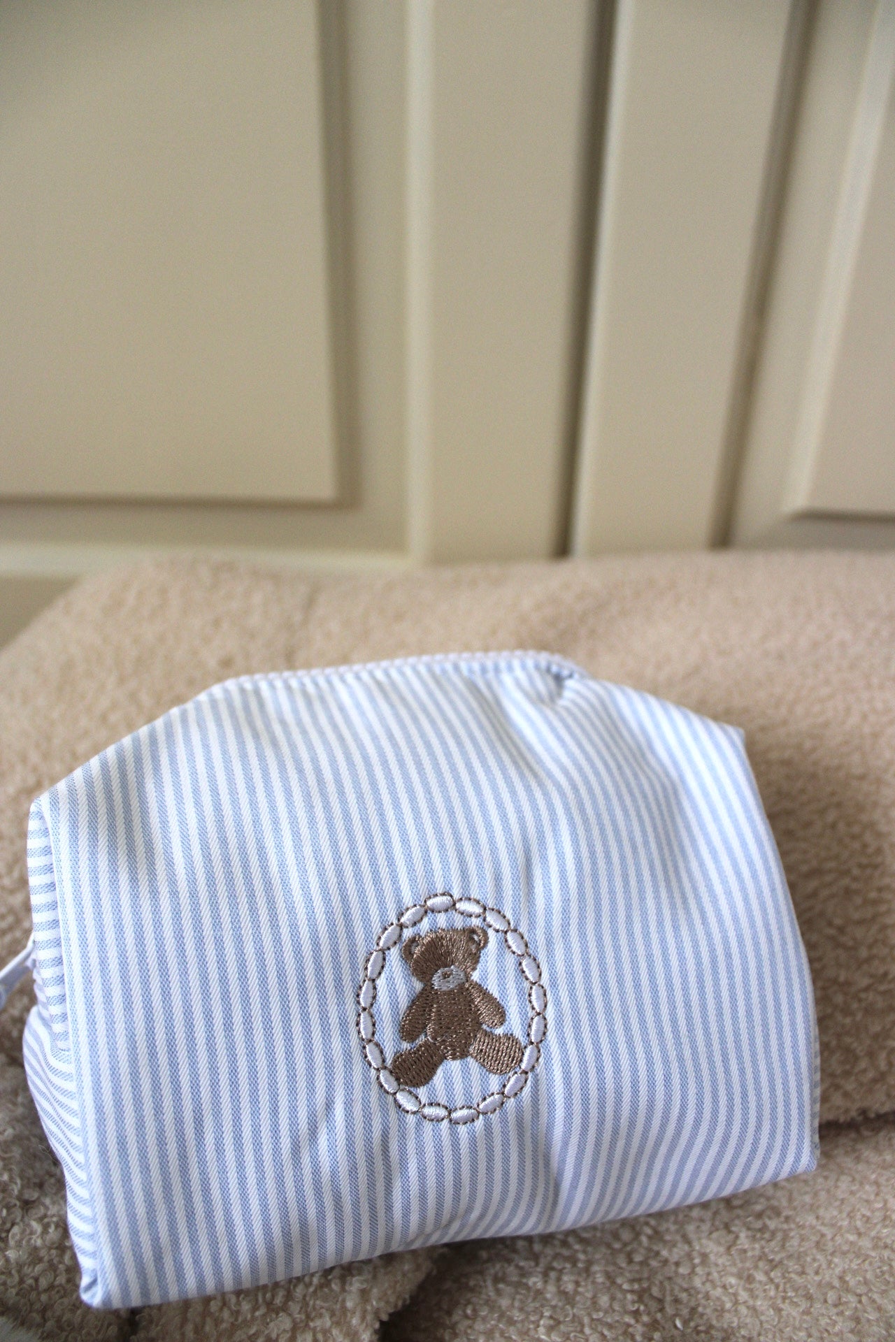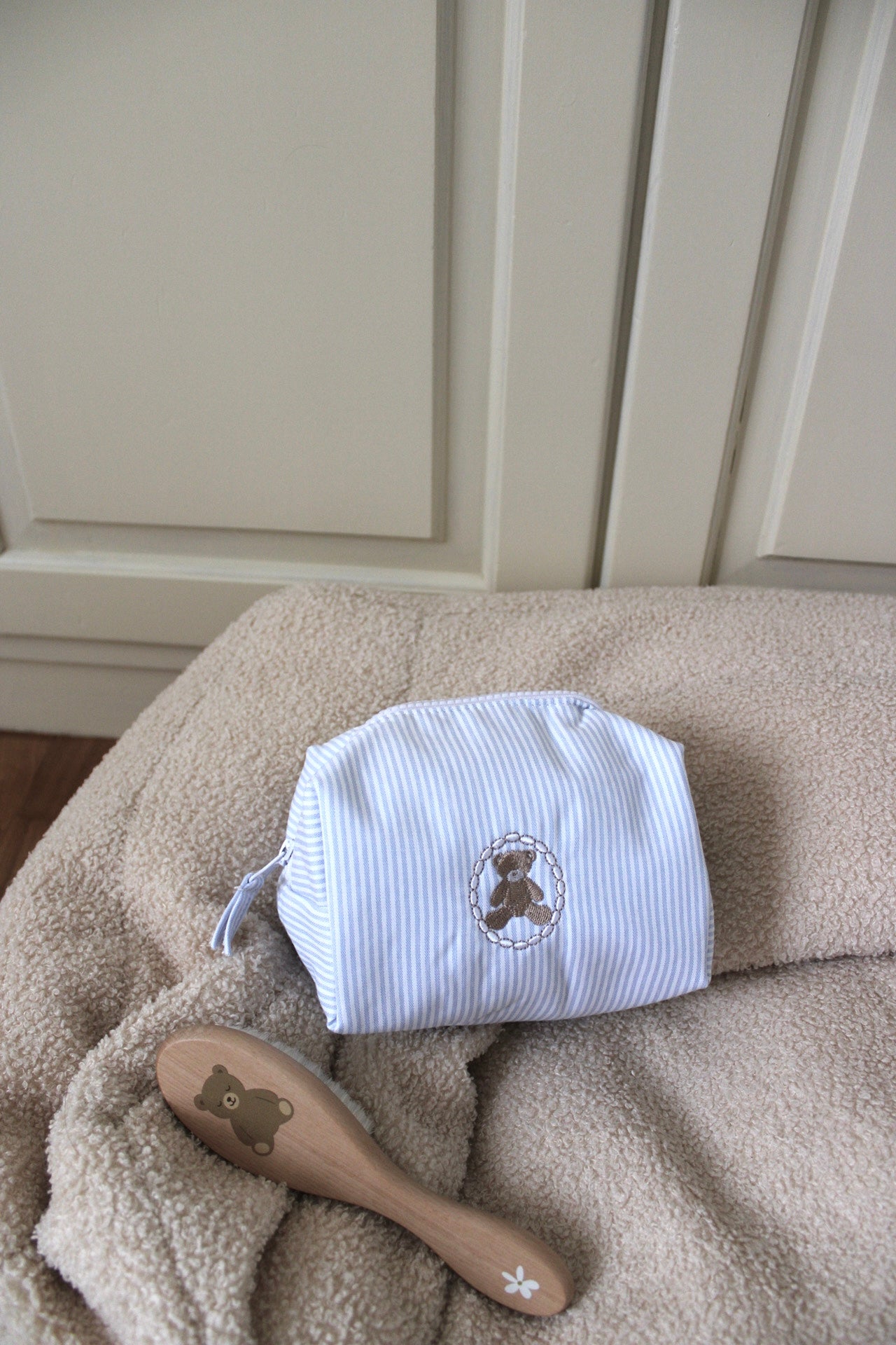 Realizzato in tessuto morbido a righe celeste, è impreziosito dal ricamo dell’orso Lou, racchiuso in una cornice delicata, simbolo di tenerezza e protezione.
