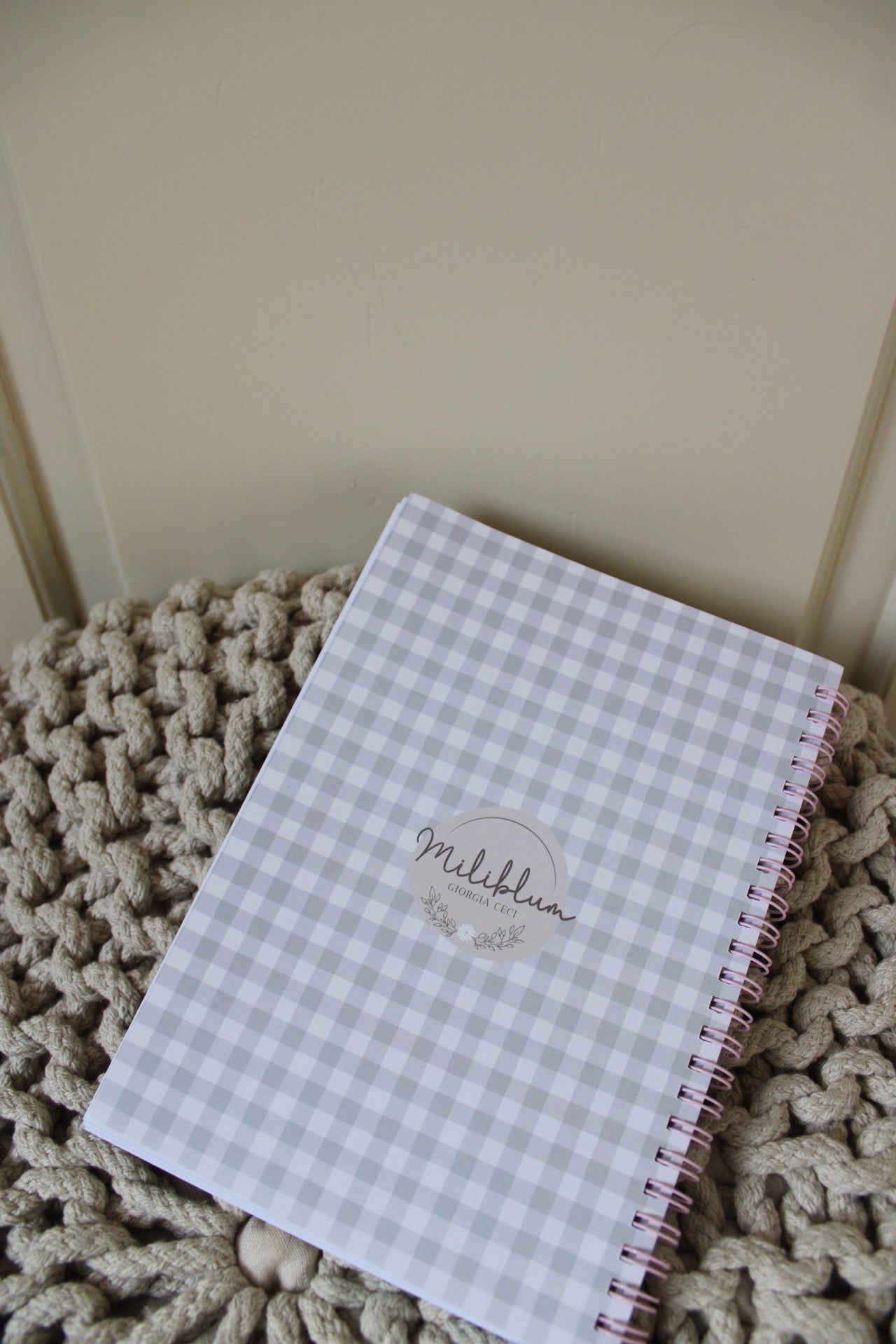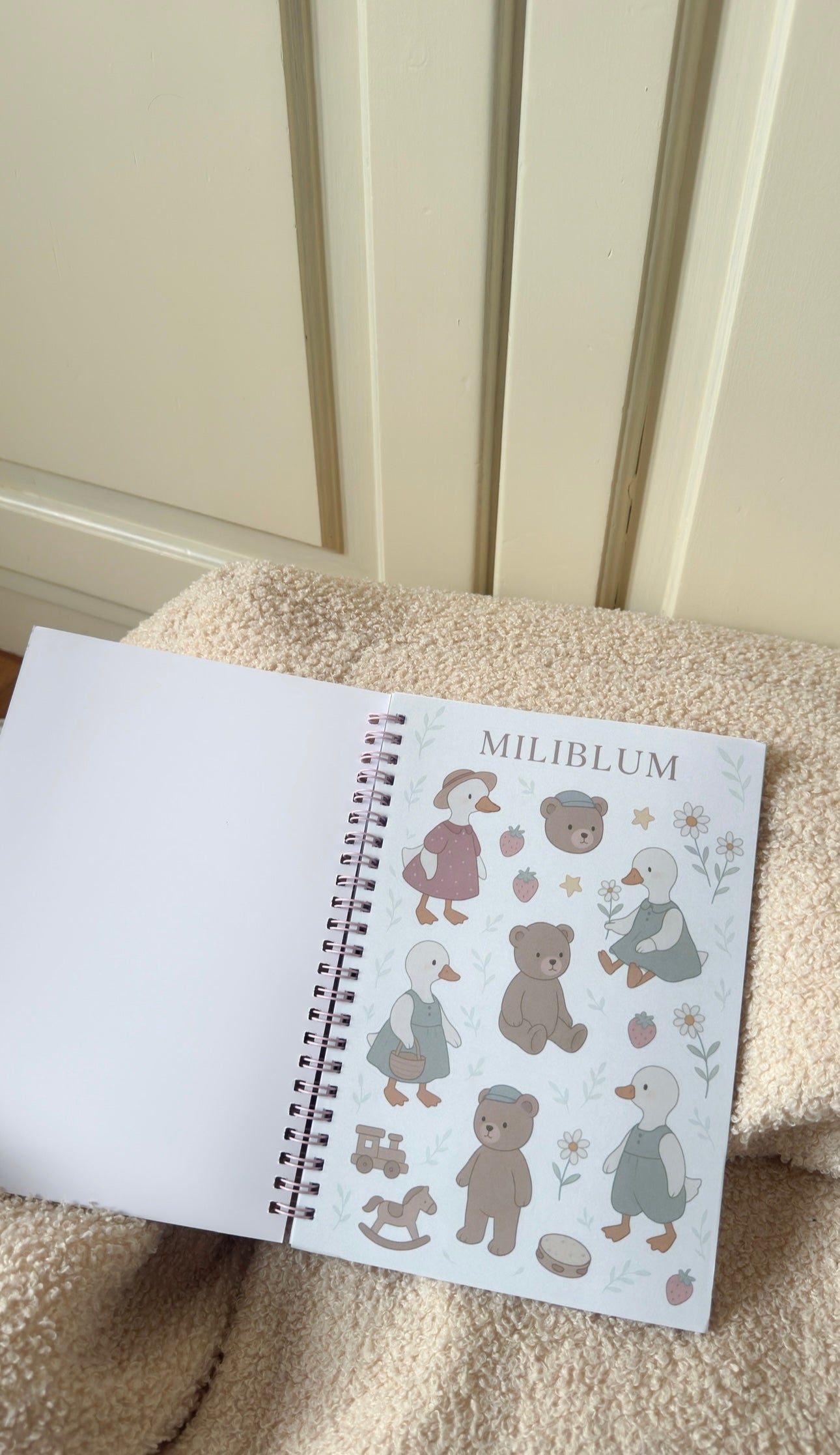 La copertina in delicato Vichy l’illustrazione di Milly l’oca, simbolo del mondo Miliblum: semplice, dolce e senza tempo.